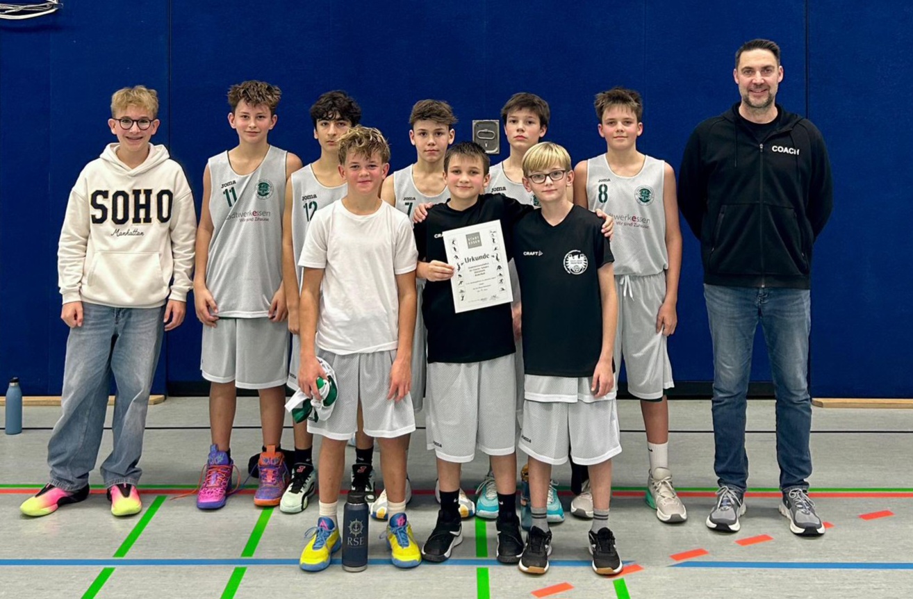 Unsere jüngsten Basketballer in der WK IV (Jg. 2013-2015) holten mit einem 66:8 Kantersieg den nächsten Essener Stadtmeistertitel an die Theodor-Hartz-Straße. Das Team des Maria-Wächtler-Gymnasiums hatte mit seinen Spielern vom ETB Schwarz-Weiß-Essen und den CroBaskets-Essen trotz guter technischer Voraussetzungen nicht den Hauch einer Chance gegen die taktisch hervorragend eingestellten DBG-Korbjäger.