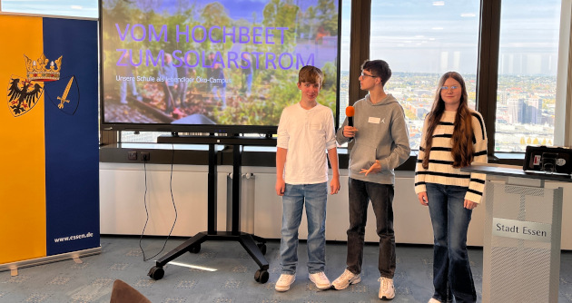 Drei unserer Schülerinnen und Schüler hatten die besondere Gelegenheit, im Essener Rathaus unsere nachhaltigen Projekte im Rahmen des Wettbewerbs „Klimaschutz in Essener Bildungseinrichtungen“ zu präsentieren. Dort stellten sie die vielfältigen Projekte unserer Schule vor, mit denen wir uns schon seit längerer Zeit aktiv für Umwelt- und Klimaschutz eingesetzt hatten. Präsentiert wurden unter anderem die Regentonnen, mit denen wir Regenwasser für die Bewässerung unseres Schulgartens sammeln, sowie die saisonalen Gemüsebeete, die nicht nur bepflanzt und gepflegt werden, sondern auch als Grundlage für Unterrichtseinheiten zu gesunder Ernährung und ökologischen Kreisläufen dienen. Auch die Nutzung des Gartens als „grünes Klassenzimmer“ und die Beschriftung der Baumarten auf unserem Schulgelände fanden Beachtung. Besonders spannend waren zudem die Zukunftsvisionen unserer Schülerinnen und Schüler, die von einer Dachbegrünung bis hin zur Installation von Solaranlagen reichen.