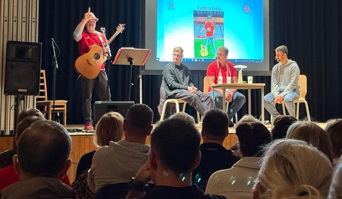 Das neunte Padders Event stand diesmal im Zeichen des Fußballs. Ein rot-weisser Abend mit Buchpräsentation, Talk und Musik war angekündigt, und als Gäste waren RWE-Vorstand Alexander Rang, Torwart Jakob Golz, RWE-Barde Thomas „Sandy“ Sandgathe und der ehemalige Wettkönig von „Wetten dass?“, Johannes Witzenrath, an die Theodor-Hartz-Straße gekommen. DBG-Lehrer Georg Schrepper stellte einzelne Kapitel aus seinem neuen Buch „Rot-Weiss Essen. Populäre Irrtümer und Wahrheiten" vor, an die sich jeweils thematisch eine Talkrunde anschloss. Sandy sorgte zwischen den Beiträgen für die musikalische Unterhaltung und stellte am Ende seinen neuen RWE-Song "Bleib was wert" vor. Premiere seines insgesamt 38. RWE-Liedes mit einem beeindruckenden Saxofon-Solo von Thilo Fälski. Johannes Witzenrath ließ die beiden RWE-Vertreter in einem Quiz gegen Jonas und Jakob aus der 9b antreten. Das spannende Quizduell endete 9:9. Am Ende der Veranstaltung saßen die Talkgäste am Bühnenrand und beantworteten die auf Bierdeckeln geschriebenen Publikumsfragen.