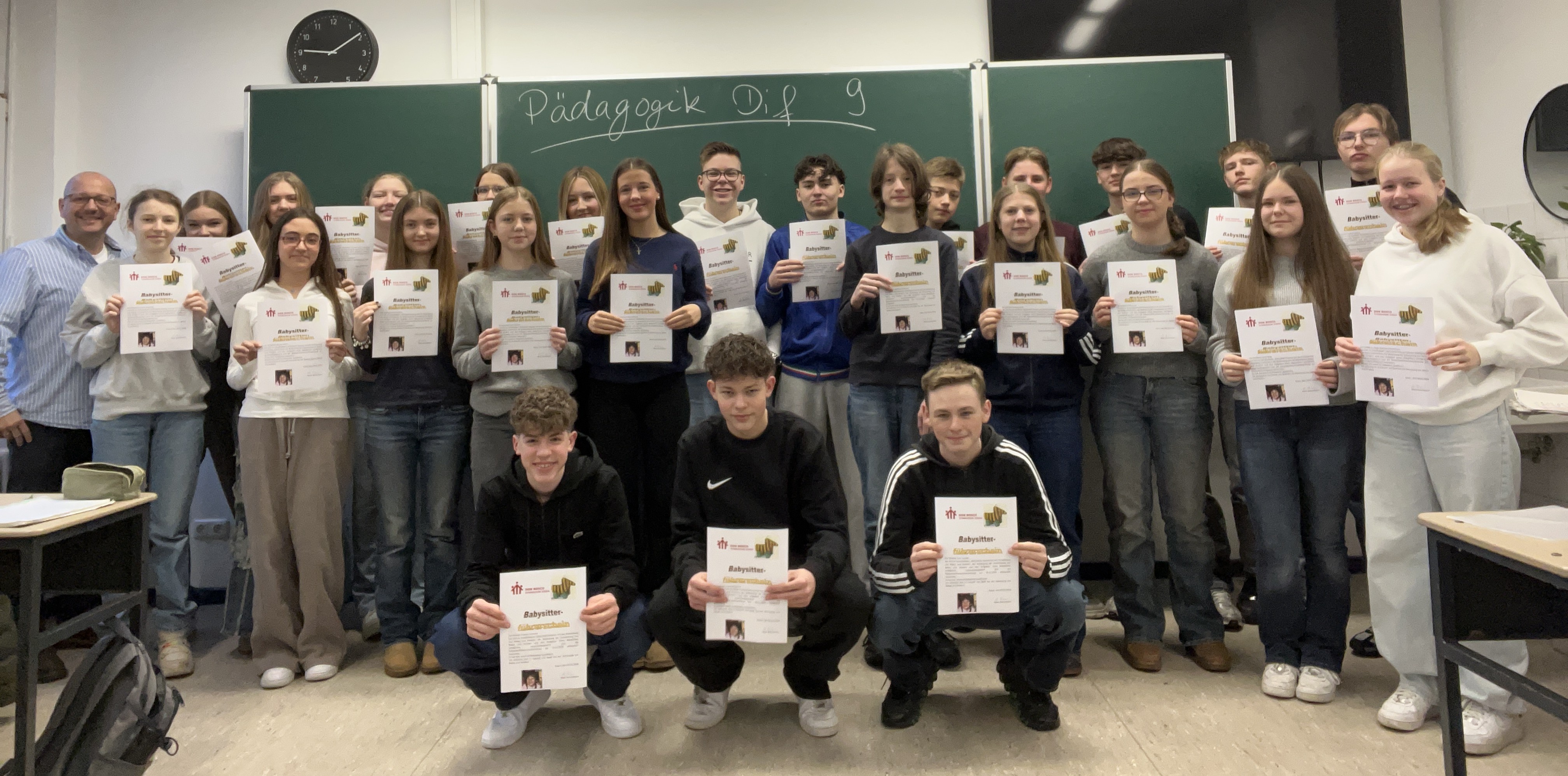 Geschafft: die Schülerinnen und Schüler des Pädagogikkurses 9 halten nach der erfolgreich abgeschlossenen Prüfung zu den Themen Kindesentwicklung, Bindungs- und Explorationsverhalten und die pädagogische Beurteilung von Fallbeispielen und Filmausschnitten von Babys und Kleinkindern ihre Zertifikate in der Hand und dürfen sich ab nun als qualifizierte Babysitter engagieren. Wir wünschen viel Erfolg und Spaß dabei.